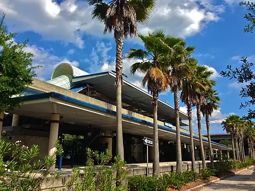 The Kings Avenue station was developed as part of the Jacksonville Skyway's Southbank segment, which carried the Skyway over the St. Johns River via the Acosta Bridge. This station and the adjacent Riverplace station opened on November 1, 2000, completing the Southbank segment as well as Phase I of the Skyway's development. It is connected to the Kings Avenue Garage, a park-and-ride garage, via walkway passing beneath Interstate 95. Some Jacksonville Transportation Authority bus lines run through the station.[1]