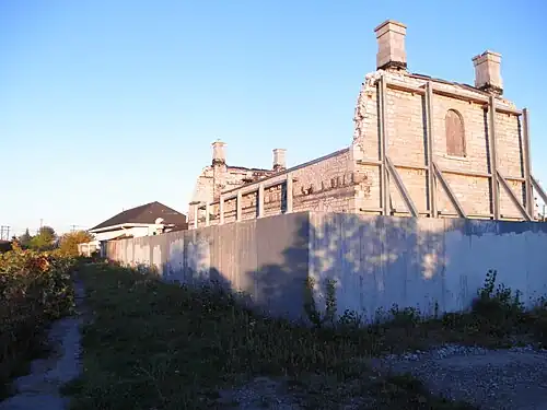 Designated in 1994 as a heritage railway station,[8][9] the abandoned station after years of neglect lay in ruins,[10][11] with only portions of the original limestone walls still standing,[12] and held in place by steel supports.[13] One 2004 report to Kingston City Council estimated a $4 million cost to restore the building and clean up toxic contamination of the surrounding grounds.[14][15] In 2014, Doornekamp Construction proposed relocating the former station to outer Wellington Street, in downtown Kingston, and rebuilding it as office space.[16]