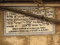 In 1908, the Central Committee bought another plot of land southeast of Knesset Bet for the construction of Knesset Gimmel.[10] The cornerstone was not laid until April 1925, in a ceremony conducted by Rabbi Abraham Isaac Kook.[10][20] Construction was completed in 1926.[3] This complex was also designed with two-story row houses on three sides of a rectangular courtyard. Marble dedication plaques commemorating donors from the United States, Australia, South Africa, Poland, and Jerusalem were affixed over the doorways of apartments in both Knesset Bet and Knesset Gimmel.[2]