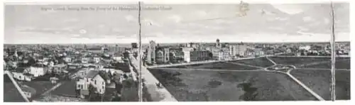 The City ca. 1913-1914 as seen from the top of the Metropolitan Methodist Church. Knox Presbyterian is in the centre of the photograph, across Victoria Park, still lacking trees or substantial vegetation.