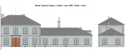 The reception building was built of bricks, the one-storey center of which was adjacent to two ground-level wings. It was 25 fathoms long, 6 wide. The roof of the building was covered with an English slate. Towards the track area there was a ground-floor annex that was covered with sheet metal. On the ground floor of the building was an engineer's office, a post office, a shelter of the pump servicer, the dispatcher and switchman flats. In the annex there was a waiting room with a cash desk. The original reception building survived at the same place for about 85 years, though it did not serve the original purpose later. Opposite the reception building behind the rails, a water tower was built with 5 fathoms deep well. From there the hand pump pumped water into the tank in the tower. The water was then led to two water cranes, from which the steam locomotive was pumping water. A steam pump was located in Pardubice. At the station, a carriage house was also built for two backup machines with a length of 20 and a width of 6 fathoms. However, this house was soon replaced by a warehouse.