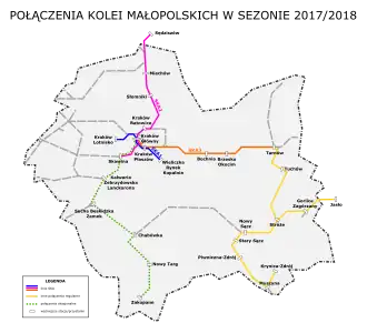 Between 2014 and 2018, Koleje Małopolskie, together with the Kraków High Speed Agglomeration Railway, gained three new routes:[7]