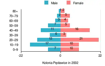 According to the 2002 Poland census, there were 143 people residing in Kolonia Pęcławice village, of whom 46.9% were male and 53.1% were female. In the village, the population was spread out, with 26.6% under the age of 18, 41.3% from 18 to 44, 21.7% from 45 to 64, and 10.5% who were 65 years of age or older.[1]