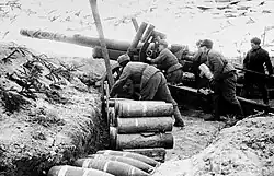 On 19 February the 3rd Panzer Army and the 4th Army attacked from the direction of Pillau, managing to force open a corridor from Königsberg to Pillau.[8] Led by a captured Soviet T-34 tank, this attack was spearheaded by the 1st Infantry Division from Königsberg, intended to link with General Hans Gollnick's XXVIII Corps, which held parts of the Samland peninsula, including the vital port of Pillau. Capturing the town of Metgethen, the unit opened the way for the 5th Panzer Division to join with Gollnick's forces near the town of Gross Heydekrug the next day. This action solidified the German defence of the area until April, re-opening the land route from Königsberg to Pillau, through which supplies could be delivered by ship and the wounded and refugees could be evacuated. This month-long battle is sometimes called the First Siege of Königsberg.[1]