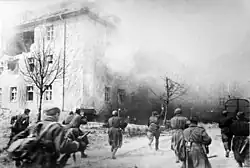 Shortly before the assault, small Combat Groups (German: Kampfgruppen) of the National Committee for a Free Germany (NKFD), an organization formed mostly of the German POWs in the USSR, took part in combat on the side of the Red Army. It was one of the small units sent for reconnaissance and infiltration of German troops and subsequent disarmament and capture of the latter, or for auxiliary combat operations. Throughout 1944, NKFD created commandos,[11] and as 1945 began, it was allowed for the NKFD to form companies;[12] members of the Combat Groups carried German weapons and were dressed in Wehrmacht uniforms.[13] A number of units consisting of "graduates" of the NKFD "anti-fascist schools" attached to the Zemland Group of Forces of the Red Army were sent to Königsberg and other places of East Prussia.[12]