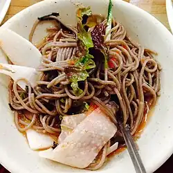 Korean noodles are noodles or noodle dishes in Korean cuisine, and are collectively referred to as guksu in native Korean or myeon in hanja character. The earliest noodles in Asia originate from China, and date back 4,000 years ago.[1] In Korea, traditional noodle dishes are onmyeon (beef broth-based noodle soup), called guksu jangguk (noodles with a hot clear broth), naengmyeon (cold buckwheat noodles), bibim guksu (cold noodle dish mixed with vegetables), kalguksu (knife-cut noodles), kongguksu (noodles with a cold soybean broth) among others. In royal court, baekmyeon (literally "white noodles") consisting of buckwheat noodles and pheasant broth, was regarded as the top quality noodle dish. Naengmyeon, with a cold soup mixed with dongchimi (watery radish kimchi) and beef brisk broth, was eaten in court during summer.[2]