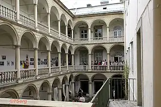 After Korniakt's death in 1603, King Władysław IV Vasa stayed at his palace. He got smallpox and recovered here. The son of Korniakt sold the tenement house to the Discalced Carmelite monastery, from whom it was purchased in 1640 by Jakub Sobieski, the Voivode of Bełz.[1] After his death and that of his wife, Teofila Sobieska née Daniłowicz, the tenement house was inherited by Jan Sobieski, the future king of Poland.[1] The Polish-Lithuanian ruler remodelled it into a palatial residence, with spacious rooms and an audience hall where he signed the Eternal Peace Treaty of 1686.