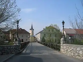 Kostanjevica na Krki (pronounced [kɔˈstàːnjɛʋitsa na ˈkə̀ɾki] ⓘ; also Kostanjevica ob Krki, German: Landstraß[2]) is a small town in the historic Lower Carniola region of southern Slovenia. It is the seat of the Municipality of Kostanjevica na Krki. Today it is part of the Lower Sava Statistical Region.[3] It is located in the northern foothills of the Gorjanci Hills near the border with Croatia. The center of the settlement is on an island in the Krka River, and it is also promoted as the "Venice of Lower Carniola" in Slovenian (Slovene: Dolenjske Benetke).