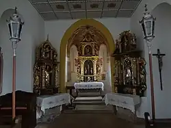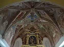 The local church on a hill above the settlement is dedicated to the Holy Cross and was built around 1500. It contains many well-preserved frescos from 1502 that depict the legends of Saint Ulrich, to whom the church was dedicated until 1867, and of Saint Corbinian. Some of the frescos in the nave, dating to around 1530,[5] are believed to be by Jernej of Loka. The hill with the church is a popular destination for short outings by locals.[6]