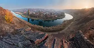 Kryvyi Rih, which in Ukrainian literally means 'crooked horn' or 'curved cape', was the name originally given in the 18th century to the general area of the present city by Zaporozhian Cossacks. According to local legend, the first village in the area was founded by a "crooked" (Ukrainian slang for 'one-eyed') Cossack named Rih (literally, 'horn'). The name likely derives from the shape of the landmass formed by the confluence of the river Saksahan with the Inhulets.[9]