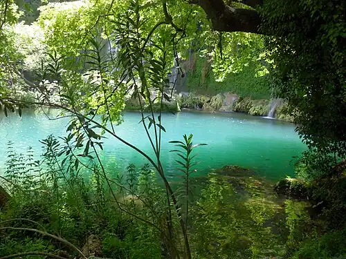 The Kurşunlu Waterfall[1] (Turkish: Kurşunlu Şelalesi) is located 19 km from Antalya, Turkey at the end of a 7 km road branching off to the north of the Antalya-Serik-Alanya highway at a point 12 km east of Antalya. It is reduced to a mere trickle in the summer months.