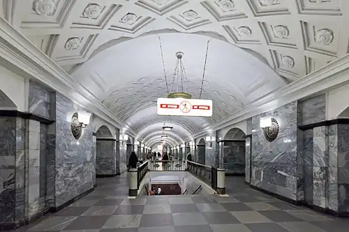 Designed by L. M. Polyakov and completed in 1938, the station has tiled walls and gray marble pylons with sconce light fixtures and circular ventilation grilles.