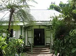 The bronze statue's placement before Salazie town hall also situated it right in front of the nearby church, pastored by a conservative young priest born in 1902, Father Gabriel Bourasseau.[2] Having been active in Young Christian Workers, he passed through the novitiate in Orly and on Madagascar, whence he was sent to Réunion at the end of two years. He had already worked as a vicar at Champ-Borne and on the Plaine des Cafres before arriving at Salazie, where he rebuilt the old wooden church into an enlarged stone parish church.[6]