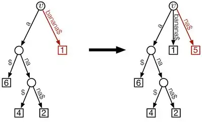 - Add a new internal node and a new edge with label . The new label consists of the missing characters of the longest common prefix of and . Thus, the concatenation of the labels of the root-to- path now displays the longest common prefix of and .