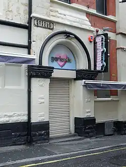 By 1975, most of the bars that had provided a safe haven for so long around Queen Square had been demolished to make way for the new St. John's Shopping Centre, Roe Street Gyratory and bus station.[48] The Bar Royal on Wood Street had become the 'place to be'.[49] Guests there were heavily vetted on arrival by its owner Sadie and the main door was bolted as people entered. The bar became a hive of activity where students mixed with dockers and glamorous transvestites and transsexuals mixed harmoniously with lesbians and gay men. By the close of the decade, the various groups had separated as heterosexual 'New Romantics' had begun to take over. After a brief close, re-opening and boycott due to rampant misogyny, the bar finally closed when Sadie died in the late 1980s.[50][51]