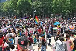 In 1979, the country's first LGBT Pride Parade, also known as LGBT Pride March, was held and attended by over one thousand people in Mexico City.[15] Ever since, it has been held every June without interruption under different slogans with the aim of bringing visibility to sexual minorities, encouraging consciousness about AIDS and HIV, denouncing homophobia, and demanding the creation of public policies such as the recognition of same-sex civil unions and same-sex marriages and the legalization of LGBT adoption, among others.[16]