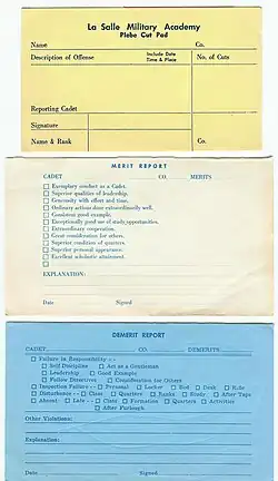 Cadets worked on a "Demerit System" in their daily activities in the JROTC program. Demerits were typically issued during personal and room inspections when deficiencies were found. Sometimes they were issued for failing to report for formations or lateness. Other times they were issued for insubordination, failing to follow orders or wisecracks. Accumulation of 20 or more demerits for lower classmen and 15 for upperclassmen on a given week resulted in "Post Duty" which was not standing guard as was required in the regular Military. For LSMA cadets, "Post Duty" meant marching with a rifle on Company Street beginning on a Friday Afternoon and for some, extending to Saturday morning when most of the other cadets had either gone home for a special weekend furlough, or began the day of "free time". Other times in lieu of marching Post Duty, cadets were required to do "Hunyak Duty." (The term "Hunyak" was cadet slang for the groundskeepers.) This meant the offending cadet was made to do work maintaining the Academy grounds such as raking leaves, cleaning up litter, emptying trash bins, etc. Fortunately, an excess of demerits could be offset by the accumulation of "Merits," which were usually awarded for excellence in drill or inspections, or for doing favors for upperclassmen and sometimes Faculty members.