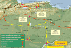With the revival of rail transport in Venezuela, La Encrucijada is planned to be the site of an important rail junction. Some construction has taken place on a mainly east-west route to the Caribbean (which roughly follows the routes of defunct 19th-century railway lines).[1] It is planned to link this route to others into the interior of Venezuela. However, construction appears to have come to a halt. In 2016 the Financial Times reported that investments in the Venezuelan rail system had become risky.[2]