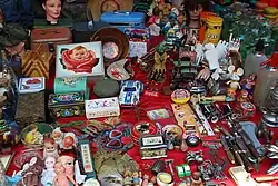 The types of antiques and collectibles sold is vast, but some of the most common include books, magazines, coins, toys, handcrafts and furniture.[1][2][21] However, other finds include silverware, movie posters, jewelry, photographs, LP records, watches, cameras, 19th century brass beds, appliances and musical instruments.[6][8][21] (mood163-164) While they can still be found today,[21] one of the objects more often sold in the past in the market was pre Hispanic artifacts, especially in the 1940s. These objects have included those from the Mezcala, Colima, Nayarit, Chalco and Totonaca cultures, ranging from the pre Classic to the post Classic periods.[22] One of the objects in greatest demand today is toys made of tin, which can sell in the United States for up to 1,000 dollars.[5] Antiques merchants here have found that economic downturns do not affect their businesses very much. They also commented that knowledgeable American and Japanese collectors pay significantly more for many items, especially for items such as comic books and toys.[5]
