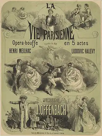 La Vie parisienne (French pronunciation: [la vi paʁizjɛn], Parisian life) is an opéra bouffe, or operetta, composed by Jacques Offenbach, with a libretto by Henri Meilhac and Ludovic Halévy.[1]