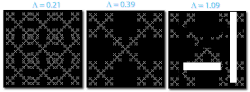 The same images as above, rotated 90°. Whereas the first two images appear essentially the same as they do above, the third looks different from its unrotated original. This feature is captured in measures of lacunarity listed across the top of the figures, as calculated using standard biological imaging box counting software FracLac, Image.