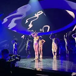 The Enigma show involves a loose storyline about "healing and finding yourself", with a setting aiming to emulate a post-apocalyptic punk environment.[11][16] A script was written by Gaga, with photographer Eli Russell Linnetz largely contributing to the creative part of the show, as well.[11] Billboard's Andreas Hale found the narrative "part Wizard of Oz and part Ghost in the Shell."[17] Gaga wanted to integrate all her past hits into the show, while also giving it "a new feel for her interpretation of a Vegas show."[11][16] The gig involves a character named Enigma, brought to life through motion capture by Gaga. Enigma was based on a character that was used during Gaga's promotional rollout for her 2013 album, Artpop, called Petga.[11] In a video posted on her social media by before the residency kicked off, Gaga referred to Enigma as her alter ego.[18] Production designer LeRoy Bennett described the show as "a journey about Gaga and her Enigma character finding themselves within each other", therefore taking place "in various settings as she's going into her virtual world and her past. But it's also the present and future, so it has to take on multiple personalities." Floating above the stage was a large light pod, which he called the "main lighting instrument" that could be interpreted as a spaceship or a cloud, or "energy beaming down on the stage to heal" Gaga.[11][16]
