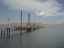 The lake is a major barrier between Urmia and Tabriz, two of the most important cities in the provinces of West Azerbaijan and East Azerbaijan.[35] A project to build a highway across the lake was initiated in the 1970s but was abandoned after the Iranian Revolution of 1979, leaving a 15 km (9.3 mi) causeway with an unbridged gap.[36] The project was revived in the early 2000s, and was completed in November 2008 with the opening of the 1.5 km (0.93 mi) Urmia Lake Bridge across the remaining gap.[37] The highly saline environment is already heavily rusting the steel on the bridge despite anti-corrosion treatment. Experts have warned that the construction of the causeway and bridge, together with a series of ecological factors, will eventually lead to the drying up of the lake, turning it into a salt marsh, which will adversely affect the climate of the region.