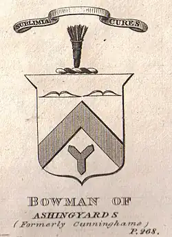 Paterson states that the Cuninghame family continuously held Ashinyards from circa 1570[18] until an eldest daughter, Elizabeth Cuninghame, married John Bowman Esq in 1695; who did however, as stated, purchase the estate.[8] John Bowman was a Glasgow merchant, and chief magistrate in 1715.[8] Their son, John Bowman, became Lord Provost of Glasgow and married a Miss Houghton of Dublin in 1734, the couple had two sons and two daughters. When he died in 1796 he left the estate and other properties in the parish to Anne, his eldest daughter, because his eldest son John married and settled in North America, whilst his second son Houghton married a Miss Vere and moved to Dominica. John Bowman changed the name from Ashinyards to Ashgrove.[8]