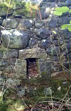 In between the two bleach works in 1858 is located a building with a very ornate walled garden, in all likelihood the dwelling of the works manager and has two dated stones of the marriage stone type, dated 1790 with 'I(J)R and JC' and 1759 respectively. The second stone is badly eroded and any initials are not discernable.[15] This relatively small building also has an access off Threepwood Road via the settlement of Townend.[15] In 1858 no name is given on the map to this dwelling. A plantation or screen of trees is shown lying to the west and a small ruin is shown on the lane to the lower bleach works where it ceases to be straight and runs in an easterly direction.