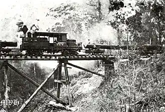 From 1912 the 18-ton Climax Class A locomotive with serial number x38 of 1912 was used.[8][9] It was sold in November 1933 to Smith & Ellis Ltd. in Langley Vale. In 1942 it was regauged to 3 ft 6 in (1,067 mm) and used at Circular Head Amalgamated Timber Co. in Smithton, Tasmania. There it was dismantled in 1971 and scrapped.[10]