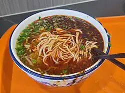 Lanzhou beef noodles are named after the city of Lanzhou, in Gansu province, which stretches to the Yellow River and was a stop on the ancient Silk Road. During the Tang dynasty, the Muslim Hui people developed a variation of beef noodle soup noodle that is compatible with the Muslim diet, with easy-to-prepare ingredients.[1][2][3] Local lore attributes its creation to Ma Baozi (马宝子), a Hui Chinese man from Lanzhou.[4] There are numerous beef noodle soups available in China, with a wider variety in the west than the east.