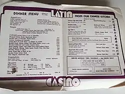 In 1960, owners Stanley and Bea Carroll, David Dushoff, and Daniel "Dallas" Gerson relocated the nightclub to 2235 Route 70 in nearby Cherry Hill, New Jersey, and built a plush 1,500-seat, Vegas-style[3] dinner theater renamed from the "Latin" to the "Latin Casino", although casino gambling was not included. It was considered one of the fanciest, hippest dinner nightclub experiences of that time featuring dinner, drinks and a showcase of top entertainment, and was called "The Showplace of the Stars".[4]