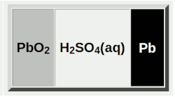 Fully charged: Lead dioxide positive plate, lead negative plate, and concentrated aqueous sulfuric acid solution.