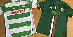 ![]() The 70th anniversary shirts used by Lechia Gdańsk (left) for the 2015–16 season, and Śląsk Wrocław (right) for the 2016–17 season. | |