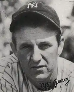 The New York Yankees purchased Gomez from the Seals for an estimated $39,000.[3] He reported in at 6 feet 2 inches (1.88 m) and weighing in at 147 pounds (67 kg). This scared many people that he was not ready for the big leagues. Gomez made his major league debut on April 29, 1930. He pitched in only 15 games and finished the season with a 2–5 win–loss record, a 5.55 earned run average (ERA). Coming into the 1931 season, Gomez had good pitching velocity, but the Yankees were concerned about the pitcher's slender frame of 6 feet 2 inches (1.88 m) and 155 pounds (70 kg). Following a common medical strategy of the time, the team had most of his teeth extracted; they also had him drink 3 US quarts (2,800 ml) of milk daily and gave him an unlimited meal allowance for road games. Gomez registered the second-best ERA in the American League in 1931.[4]