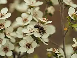 Leioproctus imitatus primarily forages on the flowers of native species in the Myrtaceae family, such as pōhutukawa (Metrosideros excelsa), kānuka (Kunzea ericoides) and mānuka (Leptospermum scoparium).[2][7] This species also shows some foraging plasticity and will forage on introduced species if necessary. L. imitatus has been recorded visiting kiwifruit flowers,[2] and agricultural studies have caught them in clover pastures and orchards.[9]