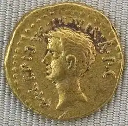 Denarius of 42 BC depicting Lepidus, aged about 57. The inscription reads III v(ir) r(ei) p(ublicae) c(onstituendae) Lepidus pont(ifex) max(imus), meaning "Triumvir for the regulation of the republic, Lepidus, Pontifex maximus".