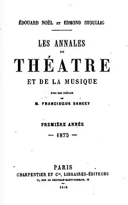 Les Annales du théâtre et de la musique (The Annals of Theatre and Music) was an annual French periodical which covered French dramatic and lyric theatre for 42 years, from 1875 to 1916. The volumes also covered concert series and necrology. It was co-edited by Édouard Noël (1848–1926) and Edmond Stoullig (1845–1918) and was published in Paris by Georges Charpentier from 1876 to 1895 and Berger-Levrault in 1896. Beginning in 1897 it was published annually by Paul Ollendorff (with Stoullig as the sole editor) up to 1914 with the penultimate volume published in 1916 (covering the years 1914–1915) and the final volume in 1918 (covering the year 1916). A total of 41 volumes were published.[1][2][3][4]