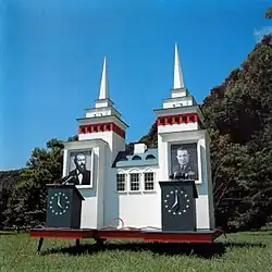 The cover art depicts a shrine built by Brian Dewan and photographed by Carol Kitman.[7] Two slightly different versions of the cover photograph exist: one that was used for domestic releases, and another that was used for all releases outside the United States with the exception of the Australian releases and Italian CD. The two men pictured behind the lecterns in the shrine are John Linnell's great-grandfather, Lewis T. Linnell (left), and Flansburgh's maternal grandfather, Brigadier General Ralph Hospital (right).[9][10]