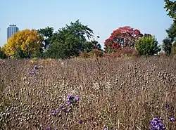 Lake dune and beach grass (left), and tallgrass prairie and woodland reserve (right), in Lincoln Park at Montrose Point, a former Nike missile base site turned nature reserve