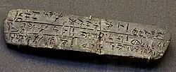 The application of Linear B texts appear to have been mostly confined to administrative contexts, mainly at Mycenaean palatial sites.[9] In the handwriting of all the thousands of clay tablets, a relatively small number of scribes have been detected: 45 in Pylos (west coast of the Peloponnese, in Southern Greece) and 66 in Knossos (Crete). The use of Linear B signs on trade objects like amphora was more widespread.[10] Once the palaces were destroyed, the script disappeared.[11]