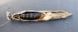 The caterpillar itself has a black or brown and white speckled head and thorax, with the remainder of the body being plain brown.[7] Female caterpillars grow larger, with the average bag of pupal females measuring 45 mm compared to pupal male bags averaging 42 mm.[3]