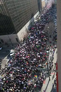 750,000 | Pershing Square – City Hall. The Los Angeles Police Department stated that "well past" 100,000 people attended the march, but did not attempt to make a more specific estimate. Officials stated that the march was the largest in Los Angeles since a 2006 immigration march attended by 500,000 people.[119] The Los Angeles Daily News reported that 750,000 people were in the crowd.[120] Organizers also said that 750,000 people had participated in the march.[121] | |