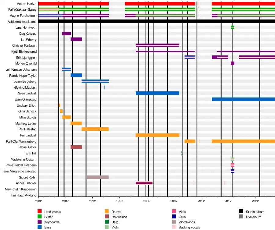 The following is a list of musicians who have toured and or recorded with the Norwegian synth-pop band A-ha, which was founded in Oslo in 1982 by Paul Waaktaar-Savoy (guitars and vocals), Magne Furuholmen (keyboards, guitars and vocals), and Morten Harket (lead vocals). Current touring musicians include drummer Karl-Oluf Wennerberg & programmer/keyboardist Erik Ljunggren (both of whom first joined in 2009) and bassist Even Ormestad (since 2015). Former musicians have included Leif Karsten Johansen, Mike Sturgis, Randy Hope-Taylor, Matthew Letley, Per Hillestad, Per Lindvall and Sven Lindvall.[1]