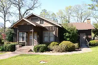 NRHP-listed[1] Single-story, T-shaped cypress log building with truss roof[2]