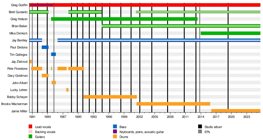 Bad Religion is an American punk rock band from Los Angeles, California. Formed in 1980, the group originally included vocalist Greg Graffin, guitarist Brett Gurewitz, bassist Jay Bentley and drummer Jay Ziskrout.[1] The band consists of Graffin, Gurewitz (who doesn't tour) and Bentley, alongside guitarists Brian Baker (since 1994) and Mike Dimkich (since 2013) and drummer Jamie Miller (since 2015).