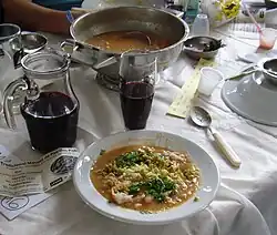 A Portuguese fish stew consisting of a wide variety of fish and potatoes, along with other ingredients. Variants include caldeirada de Camarão and caldeirada de Peixe. In Brazil, it has been described as an aromatic chowder of river fish and cilandro.[5] |