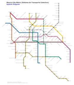 The Mexico City Metro is a rapid transit system serving Greater Mexico City.[1] The system has 12 lines, 195 stations and a total network length of 226.5 km (140.7 mi), including maintenance tracks.[2]