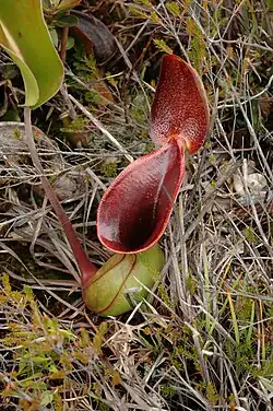 The official IUCN conservation status of each species is taken from the latest edition of the IUCN Red List.[1] Unofficial assessments based on the IUCN criteria are also included, but are presented in italics. Unless otherwise noted, taxonomic determinations and all other information are sourced from Stewart McPherson's two-volume Pitcher Plants of the Old World, published in 2009.[2] Where recent literature provides an altitudinal distribution that falls outside the range given in Pitcher Plants of the Old World, the discrepancy is noted.