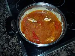 Castilla-La Mancha | stew | a dish made of tomatoes, onions, eggplant or courgettes, green and red peppers and olive oil. It is similar to ratatouille and is usually served warm to accompany a dish or with a fried egg and bread. It is also used as the filling for empanadillas and empanadas. |